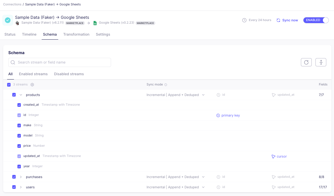 - The Schema tab allows you to modify the streams you chose during the connection setup.
